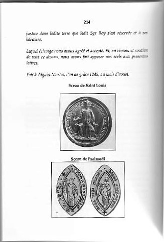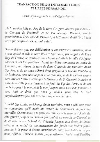 Dans l’extrait ci-dessous, il mentionne en particulier une traduction en français de l’acte d’acquisition du terrain d’Aigues-Mortes entre Louis IX et l’abbaye de Psalmodi en 1248.