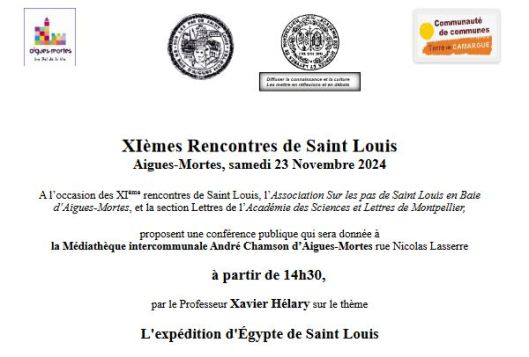Les XIèmes Rencontres de Saint Louis se sont tenues le 23 novembre 2024 à Aigues-Mortes, regroupant l’association « Sur les pas de Saint Louis en baie d’Aigues-Mortes » (SLAM en abrégé) et, dans le cadre de leur « petit » voyage, une cinquantaine de membres de l’Académie des Sciences et Lettres de Montpellier ;